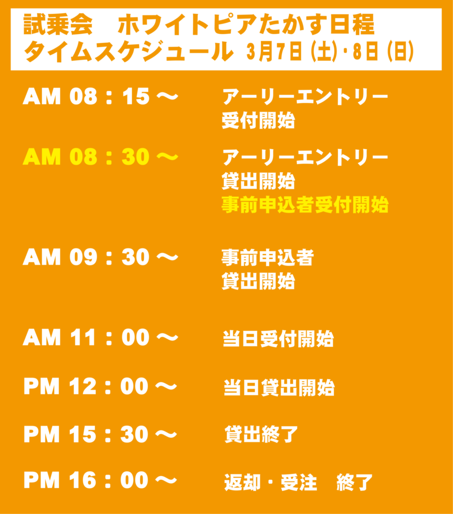 ホワイトピアたかす試乗会では、一足先に入場、貸出ができる